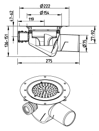 BLÜCHER Domestic-150 justerbar afløb for vinylgulve, med sideindløb og vandret Ø75mm udløb, samt indbygget vandlås. Lav model.  |