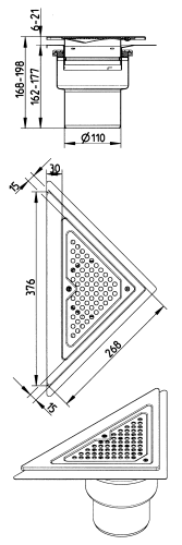 Blücher Trio type 350. Til væginstallation mod 1 bagvæg i beton- og klinkegulve, med lodret Ø110mm udløb, med membranflange til vådrumssikring.