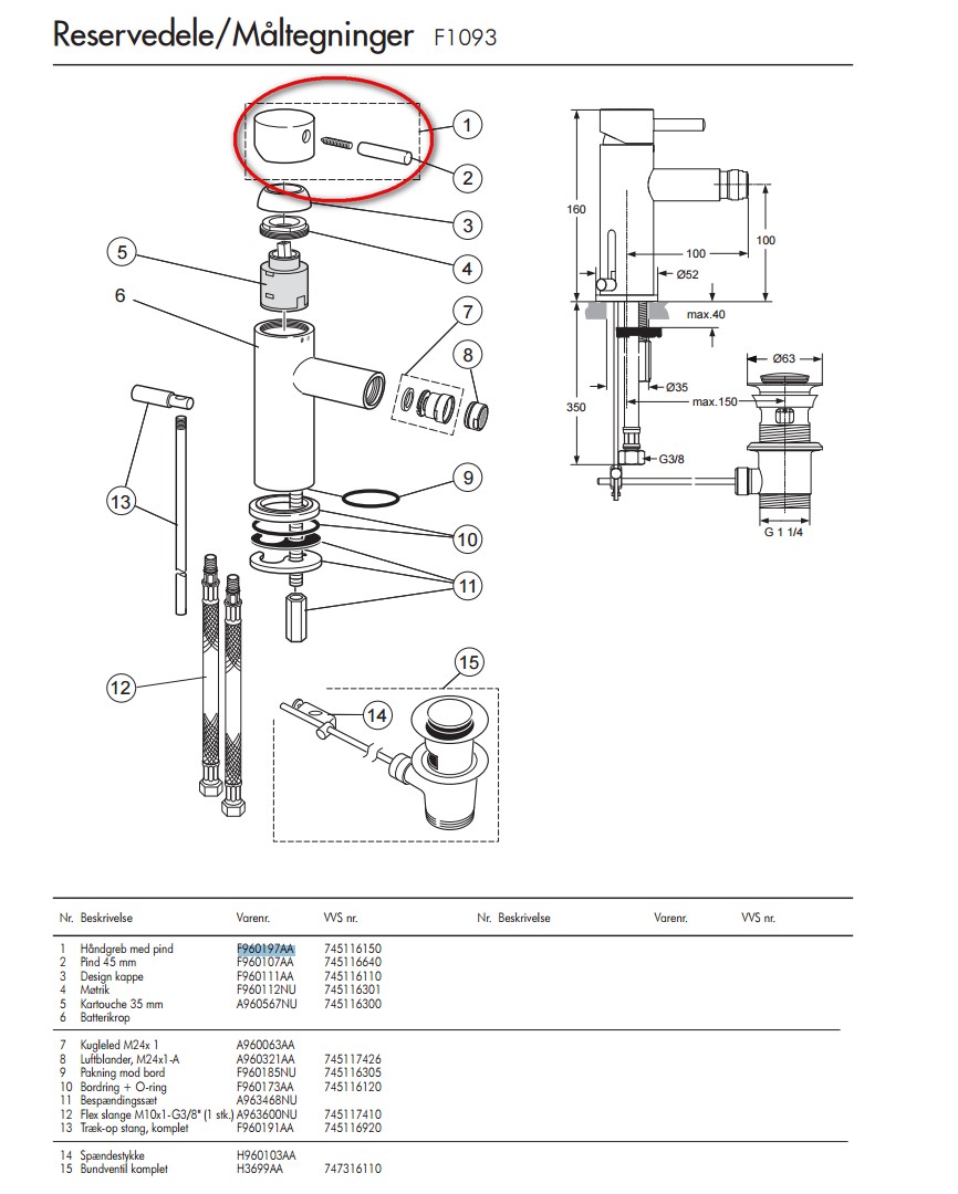 Børma A1 greb i krom med 45 mm. styrepind Passer til: Børma A1 håndvaskarmaturer Børma A1 køkkenarmaturerer Børma A1 bidétarmaturer |