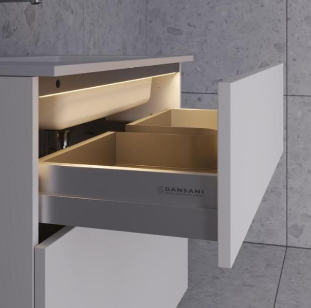 Dansani Luna LED lys og stikkontakt til skuffe Gør det nemt for dig selv med en indbygget stikkontakt og LED-lys i skuffen i dit skab eller vaskeskab. Med denne smarte funktion kan du ikke kun oplade elektroniske enheder eller tilslutte apparater direkte fra skuffen, men også få et klart og overskueligt overblik over dine ting, takket være det indbyggede LED-lys. LED-lyset giver dig optimal belysning i skuffen, så du hurtigt kan finde det, du har brug for, selv i de tidlige morgentimer. Slip for besværet med ledninger og forlængerledninger, og skab en mere organiseret og moderne badeværelsesoplevelse, hvor alt er inden for rækkevidde – uden synlige ledninger, der forstyrrer din æstetik. Specifikationer: