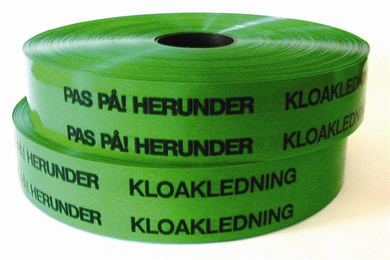 Markeringsbånd grøn 50mm bred - 500 meter med teksten: PAS PÅ! HERUNDER KLOAK. Dette bånd bruges til at undgå skader ved senere gravearbejde omkring kloakrøret. Derfor kan det kraftigt anbefales, at bruge dette bånd, da en overgravning kan blive en bekostling affære. |