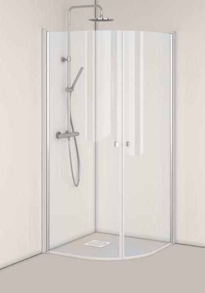 Monteringsvenligt brusehjørne med limbare profiler i aluminium. Nemt at installere og justere for én person, InstaQuick™. Vendbare døre. 6 mm hærdet sikkerhedsglas. 8 mm frihøjde fra gulvet. Højde 2000 mm. Kan monteres med udvendige 12-mm-rør, cc 35 mm. 18 mm glideskinne medfølger.