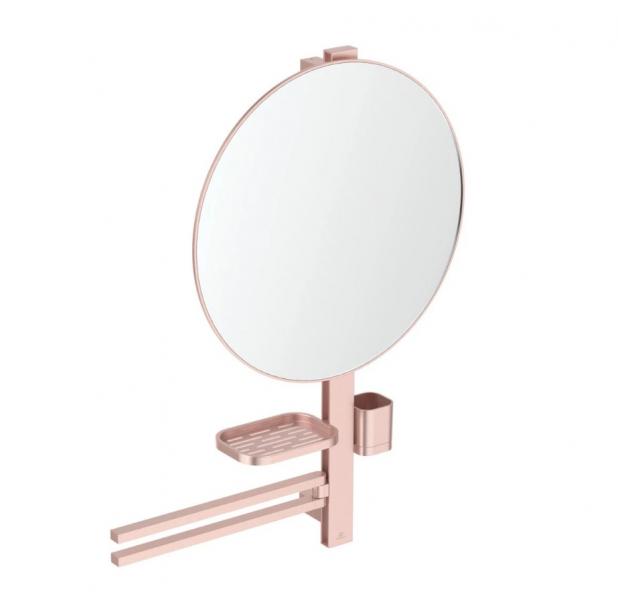 Ideal Standard Alu+ multifunktionelt spejl m/håndklædeholder - Large - Rosé Med dette multifunktionelle spejl fra Ideal Standard Alu+ får du ikke blot det uundværlige spejl, men også både en hylde og beholder til opbevaring, samt en dobbelt håndklædeholder i ét produkt. Ikke nok med det, så er designet enkelt og tidssvarende. Som hele Ideal Standard Alu+ er dette produkt produceret i aluminium med 84% genanvendt materiale. Overfladen er mat i farven "Rosé", som minder om rosegold. Specifikationer: