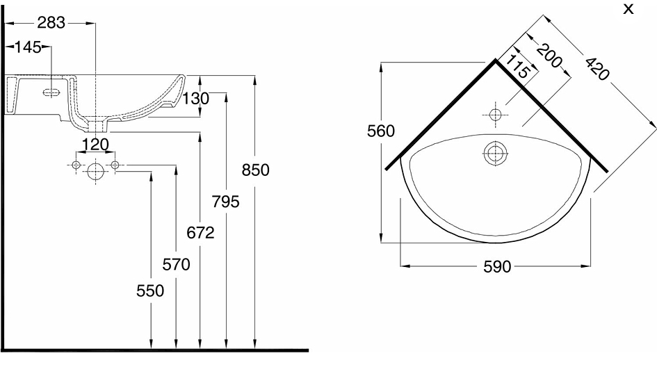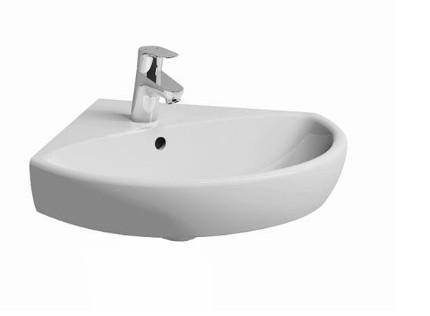 Ifö 50 hjørnehåndvask t/væg -1 hanehul Ifö hjørnevask 500 x 500 mm - fremspring 560 mm og bredde 590 mm. Til boltemontering. Specifikationer: