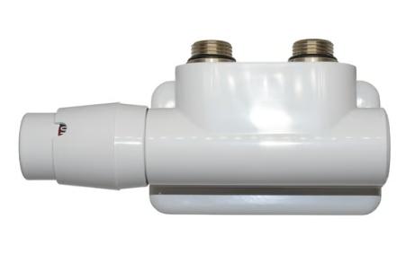 KRISS Twin RTL, 1/2" vinkelløbende ventilsæt med manuel regulering til 50 mm centerafstand, lakeret hvid (RAL9016). Ventilsættet er inkl. front-dækkappe, 1/2" tilslutningsrør samt rosetter til væggen – alt i ét varenummer. OBS: fremløb I højre side. Ikke vendbar.  |