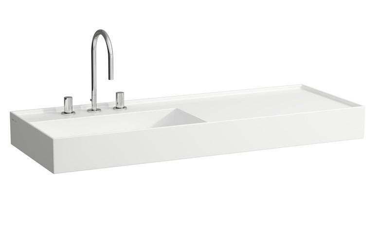 Kartell by Laufen 120 møbelvask - 1 hanehul - Uden overløb - LCC Håndvask, hylde til højre, med specielt skjult afløb. NB Billedet viser 3 hanehuller, denne er med 1 hanehul SaphirKeramik med Laufen CleanCoat, et ekstra lag glassur der gør den mere modstandsdygtig overfor snavs og kalk. Specifikationer: