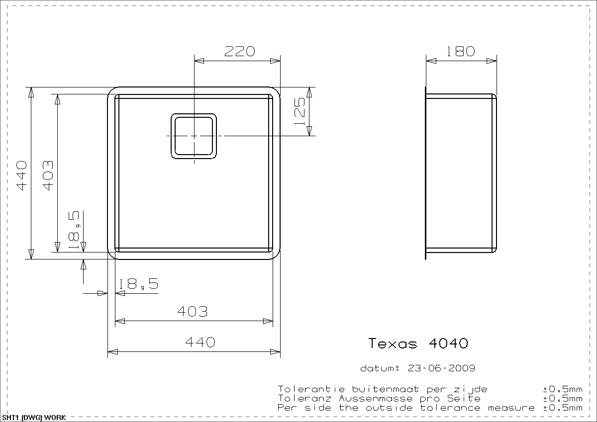 Rustfri stålvask, uden hanehul, i moderne firkantet design med kvadratisk afløb.