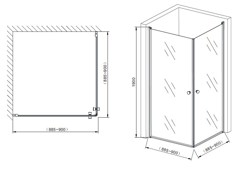 Bruseafskærmningen placeres i hjørnet, og den består af to døre i klart sikkerhedsglas med en tykkelse på 6 mm.