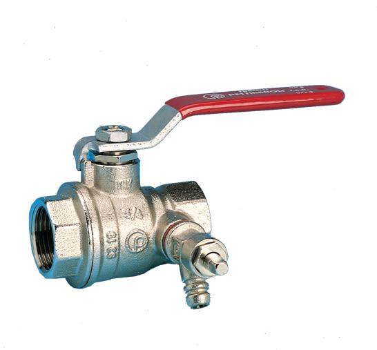 Kuglehane med fuldt gennemløb og aftap. Muffe/muffe. Rødt stålhåndtag.