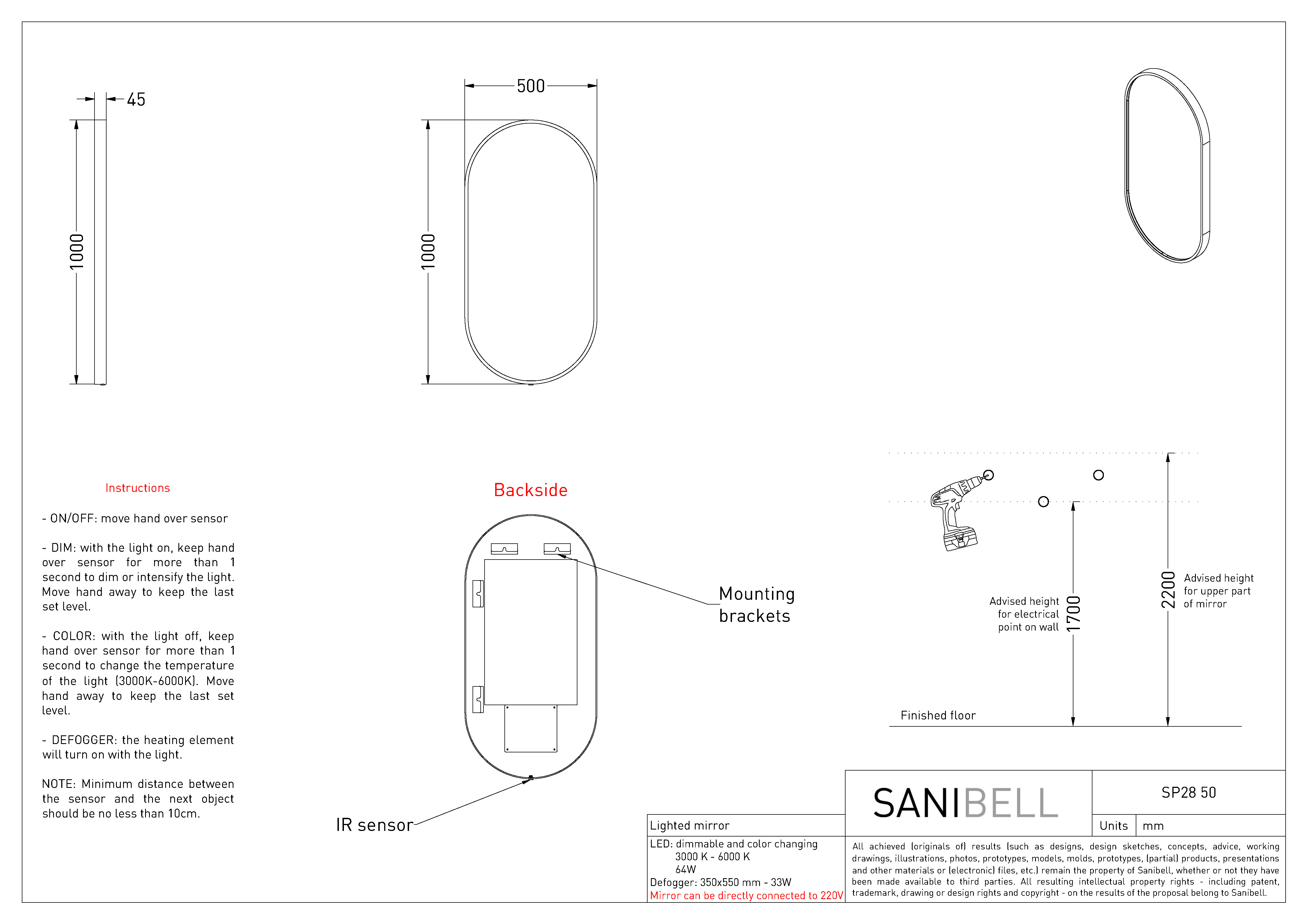 Sanibell Ink SP28 ovalt spejl m/lys, varme og sensor 50 x 100 cm - Mat sort