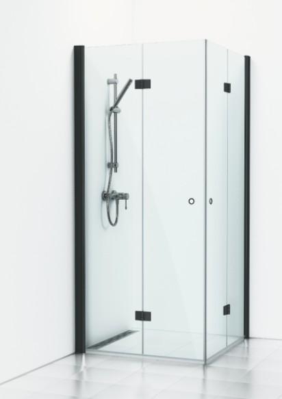 Svedbergs Skoga firkantet niche m/foldedøre - 80x80 - Mat sort Består af to åbningsbare foldedøre (180°) med transparent tætningsliste mod gulv og mellem glassene. Dørene kan åbnes/foldes indad, praktisk hvis der står møbler i vejen udenfor, og til at frigøre gulvplads. Ingen tærskel - handicapvenlig.