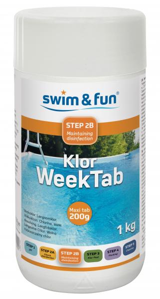 Klor WeekTab langsomklor tabletter benyttes til at fastholde et passende klorindhold i vandet, så det hele tiden holdes rent og friskt. Tabletterne indeholder stabilisator, som modvirker nedbrydning fra solens UV-stråler. Afhængig af aktivitet og vejrforhold, tilsættes nye tabletter ca. én gang om ugen.