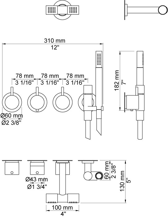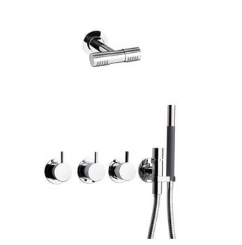 Vola 5471R-081D komplet brusesystem m/termostat - Krom Vola Indbygningstermostat ¾'' med omskifter T2 håndbruser med metalslange og holder til højre Dobbelt hovedbruser, 115 mm Separat udløb Rosetter Krom 16 3/4''RG/PEX  |