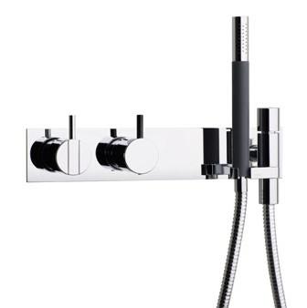 Vola Et-grebsblander for stor vandmængde med keramisk ventilenhed og omskifter samt løs afgangsmuffer. T2 Håndbruser med metalslange og holder Separat udløb Dækplade Krom 16 ½''RG/PEX  |