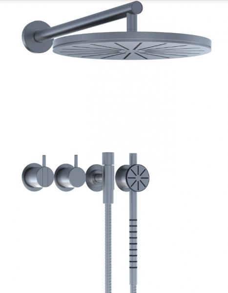 Vola Et-grebsblander for stor vandmængde med keramisk ventilenhed og omskifter samt løs afgangsmuffer. Tilslutning inkl. håndbruser T60 Hovedbruser, rund, vægmonteret Rosetter højre Krom 16 ½''RG/PEX Denne model er UDEN termostat  |