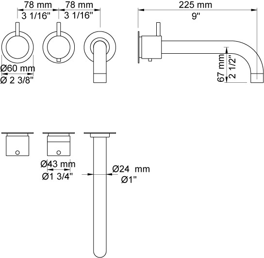 Vola Indbygningstermostat med fast afgangsmuffe Fast udløb, 225 mm, ø24 mm Rosetter Krom 16 3/4''RG/PEX