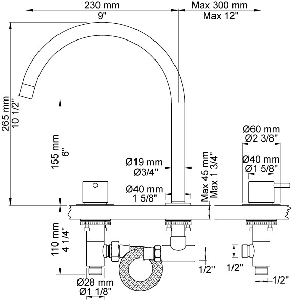 Vola To-grebsblander bestående af 2 stk keramiske stopventiler Svingbar udløb, udlæg 230 mm, ø19 mm Standard 25 mm Rosetter Krom 16 ½''RG  |